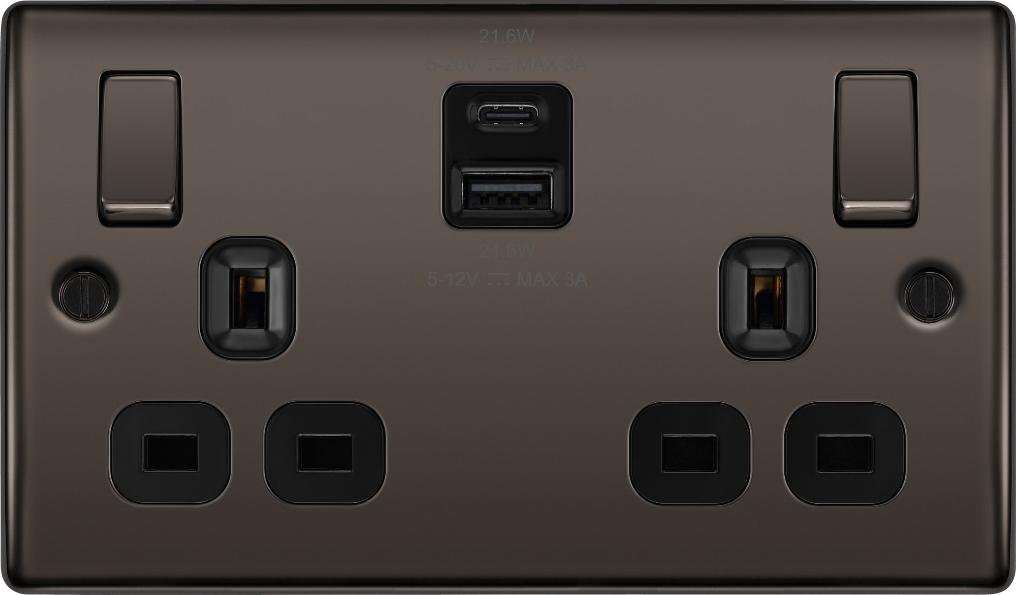 BG NEXUS NBN22UAC22B 2 GANG 13AMP USB SOCKET TYPE A + C BLACK NICKEL BLACK INSERT 22WATT