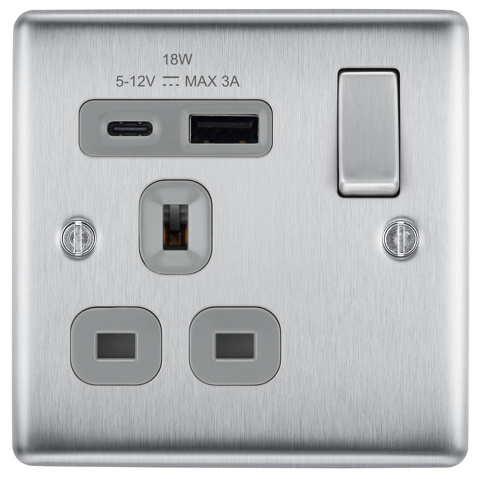 BG Nexus Metal Brushed Steel 13A Single Switched Socket with USB A + C – Premium Fast Charging Solution Enhance your interiors with the BG NBS21UAC18G Single Switched Socket, a sleek, high-performance socket featuring integrated 18W USB-A and USB-C ports with PD and QC fast charging protocols, delivering 50% charge in 30 minutes and 70% faster charging than standard 5V outlets. Crafted with a premium brushed steel finish, grey inserts and a moisture control gasket, it includes smart charging, twin earth and a 25mm minimum mounting depth for easy retrofit installations.
