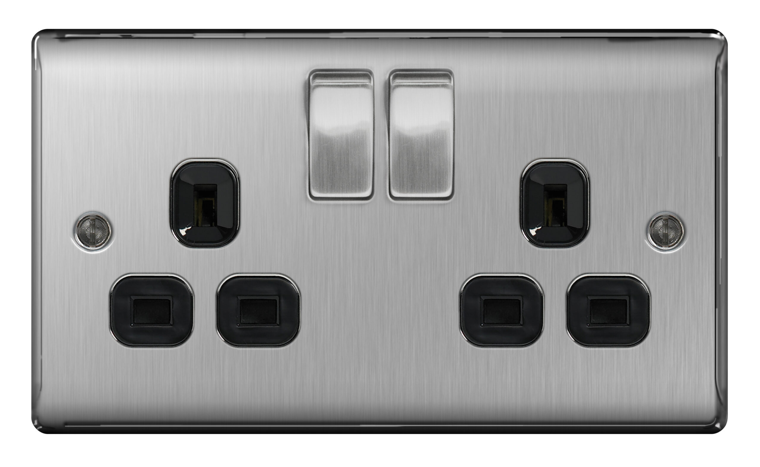 BG NEXUS NBS22B 2 GANG 13AMP SWITCHED SOCKET BRUSHED STEEL BLACK INSERT