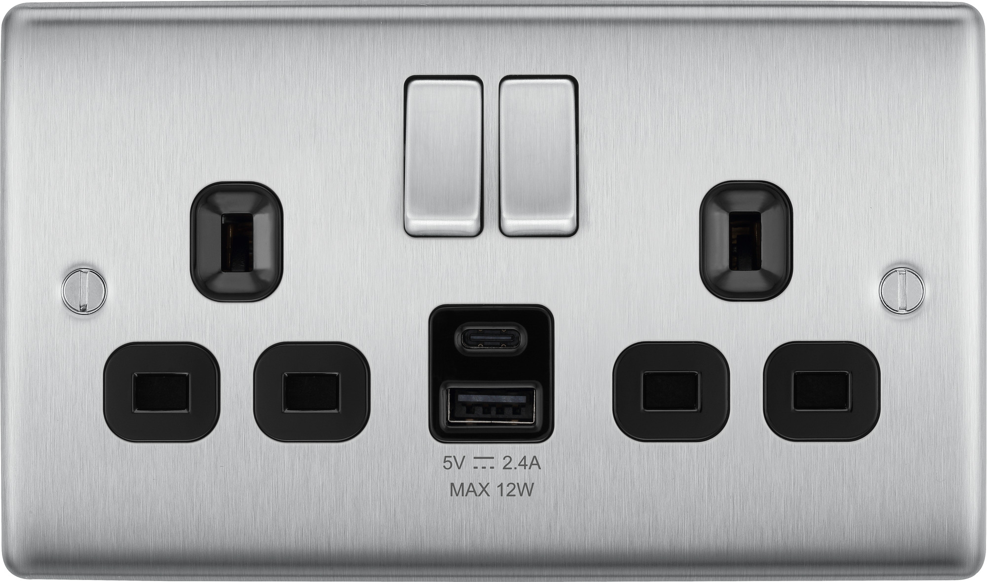 BG NEXUS NBS22UAC12B 2 GANG 13AMP USB SOCKET TYPE A + C BRUSHED STEEL BLACK INSERT