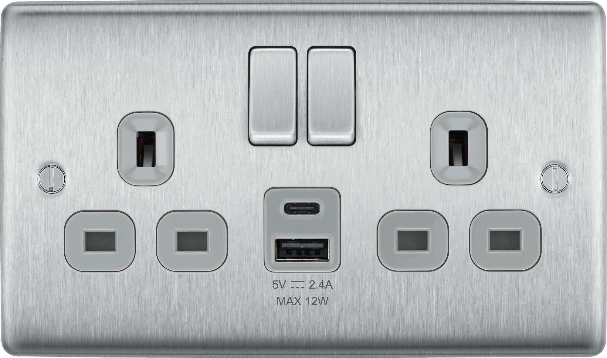 BG NEXUS NBS22UAC12G 2 GANG 13AMP USB SOCKET TYPE A + C BRUSHED STEEL GREY INSERT