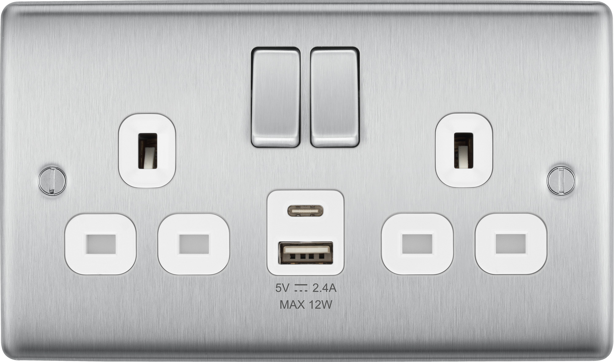 BG NEXUS NBS22UAC12W 2 GANG 13AMP USB SOCKET TYPE A + C BRUSHED STEEL WHITE INSERT