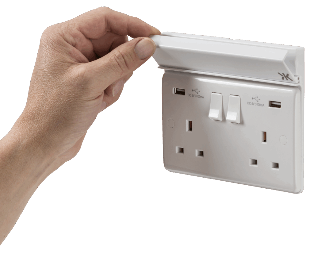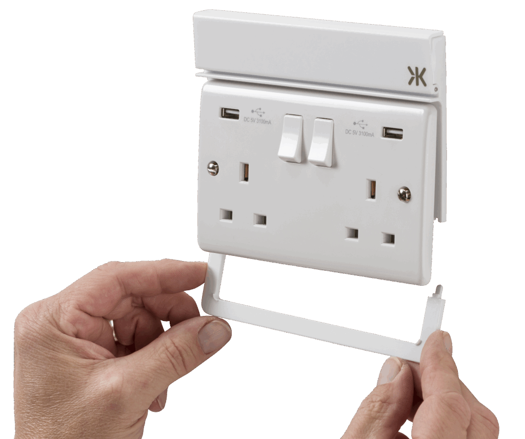 - Handy flip down Phone holder for use with Double switched sockets with USB charging facility.
