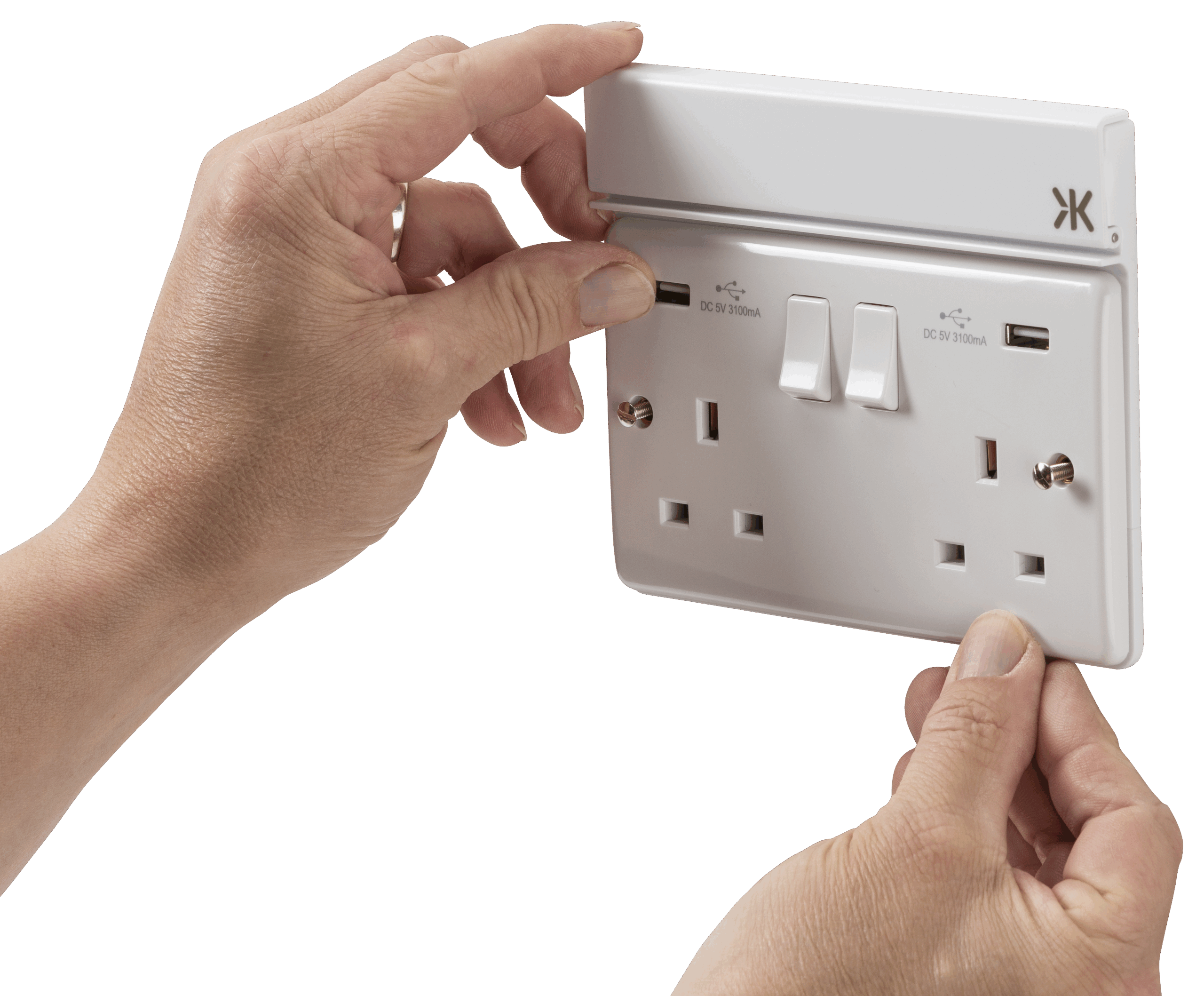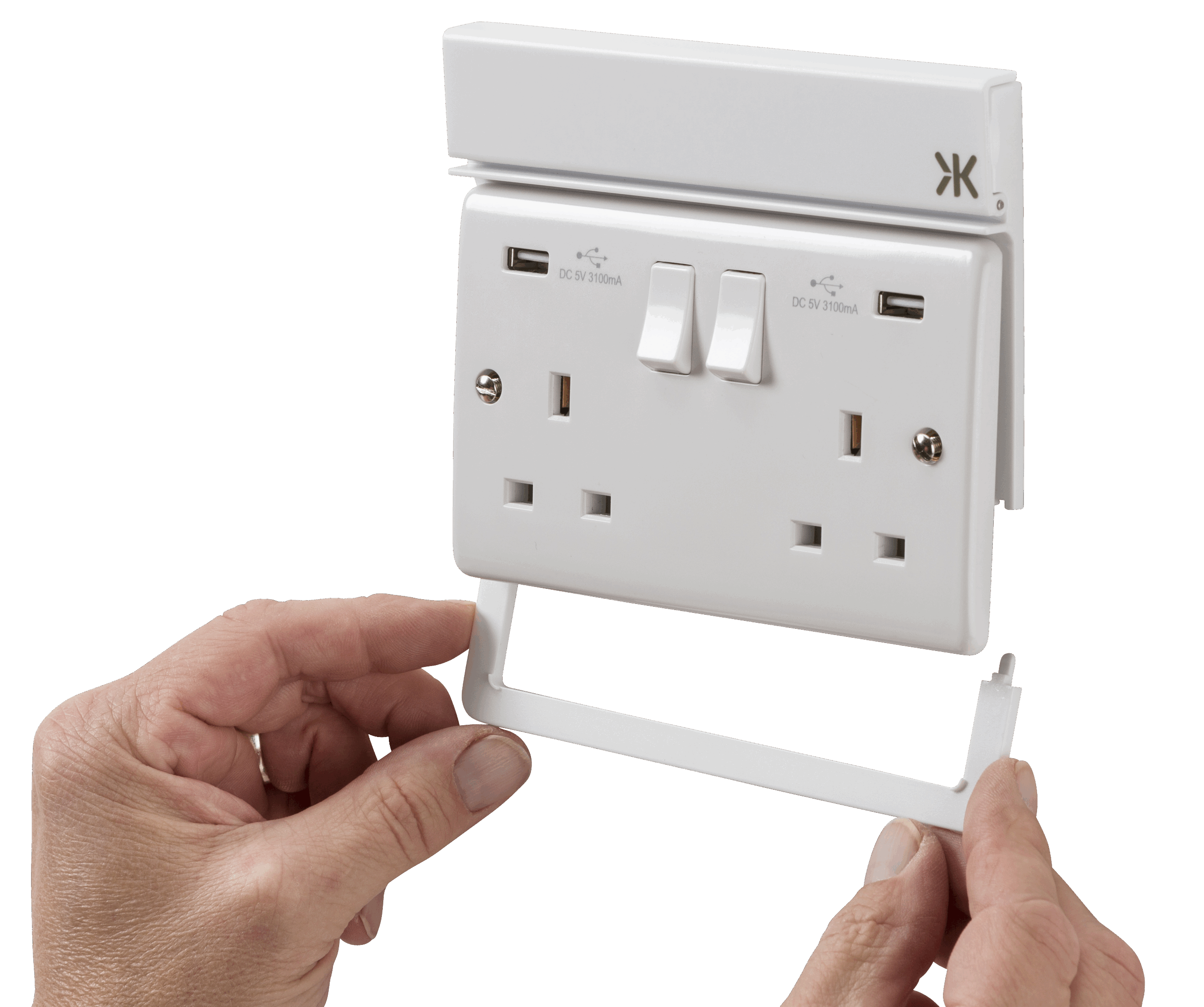 - Handy flip down Phone holder for use with Double switched sockets with USB charging facility.