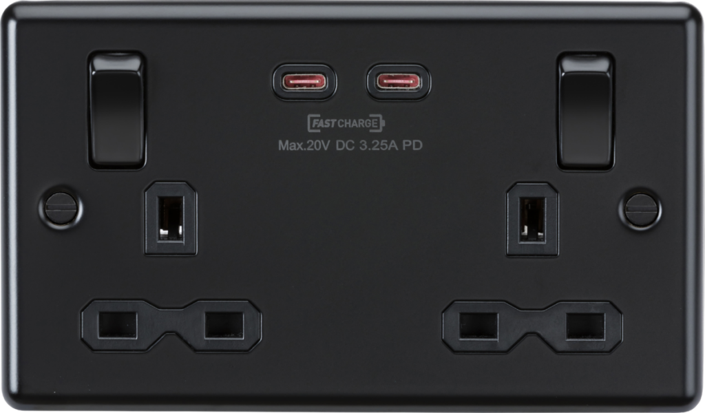 These metal decorative rounded edge USB charging sockets output at a maximum of 65W over either of the USB-C ports. They are ideal for locations where you might want a fast charge or to power a device like a laptop. They intelligently switch the voltage to give your device what it needs. Ideal for homes, offices, home offices, coffee shops, bars, restaurants, hospitality areas or anywhere a convenient power supply for charging and powering devices like laptops is needed. Supports USB-PD, a recognised standard for charging devices using a USB connection. To take advantage of this, your device must support USB-PD. Also supported is the new PPS protocol that focuses on precise control of voltage and current during charging, making it ideal for laptops. Knightsbridge recommend that you only use certified USB cables for safety and to ensure compatibility. It is also important to ensure your USB can handle the power output. Most cheap USB cables are only rated to 30W, some to 60W. We recommend only using 100W+ rated cables with this device.