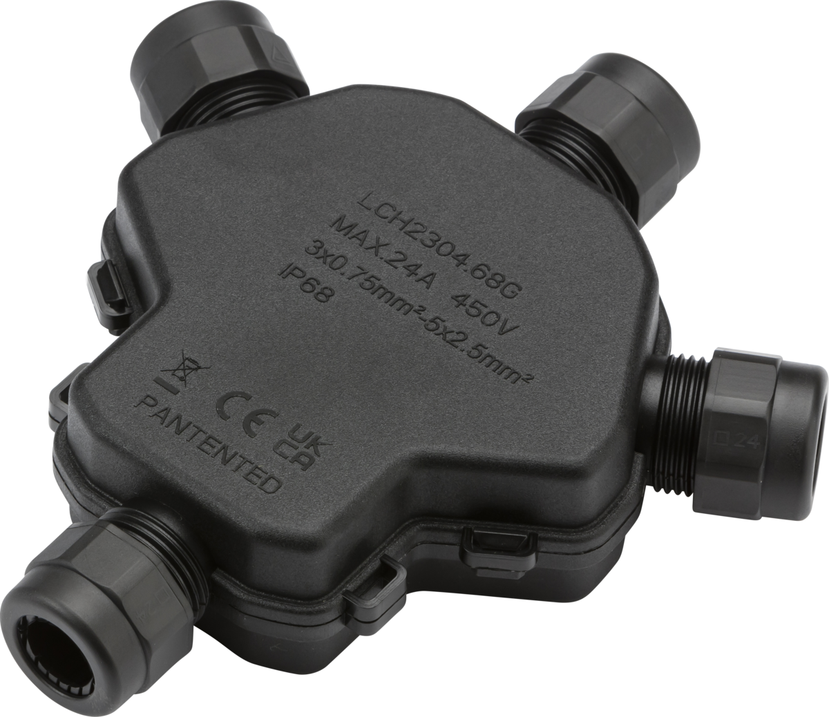 Manufactured from PA66, V-0, 960 C, PTI:250 with silicon sealing gasket.