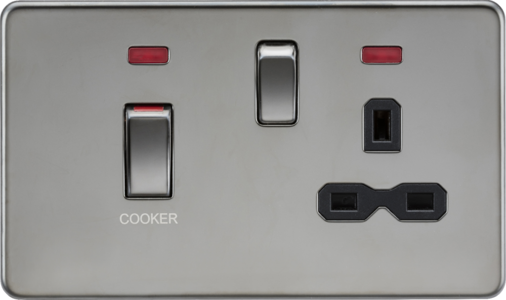 Cooker control units enable isolation of the unit so that maintenance and repairs to be carried out separately. The unit can be switched off, preventing the appliance from being turned on accidentally – for example whilst cleaning. Control two or more cooking appliances in the same room, providing rating is sufficient. This model combines a 45A switch with a 13A socket.