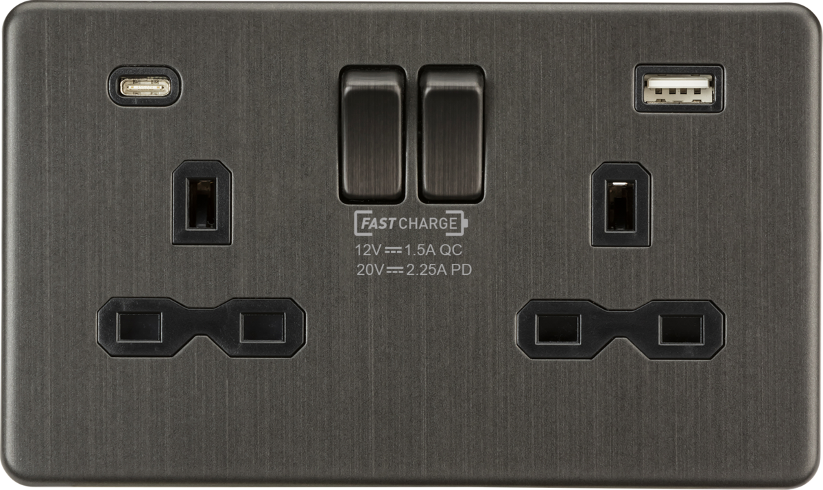 KNIGHTSBRIDGE SFR9945SB SCREWLESS 2 GANG SWITCHED SOCKET C/W A + C FASTCHARGE USB